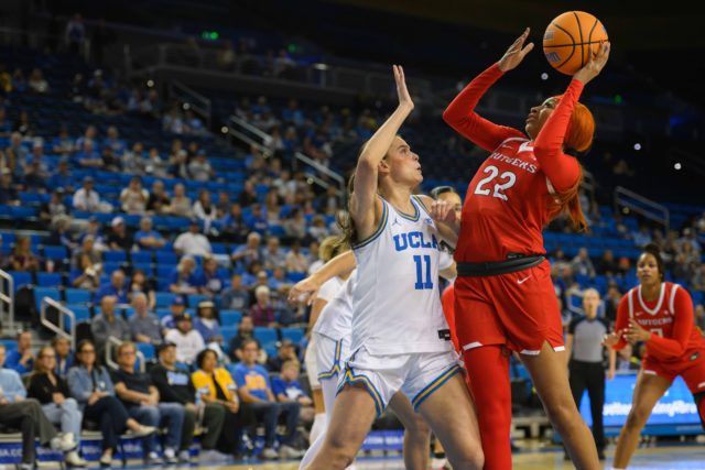 Senior guard Gabriela Jaquez defends a Rutgers’ shot-taker. Jaquez was perfect from the charity stripe to log 14 points. (Michael Gallagher/Assistant Photo editor)