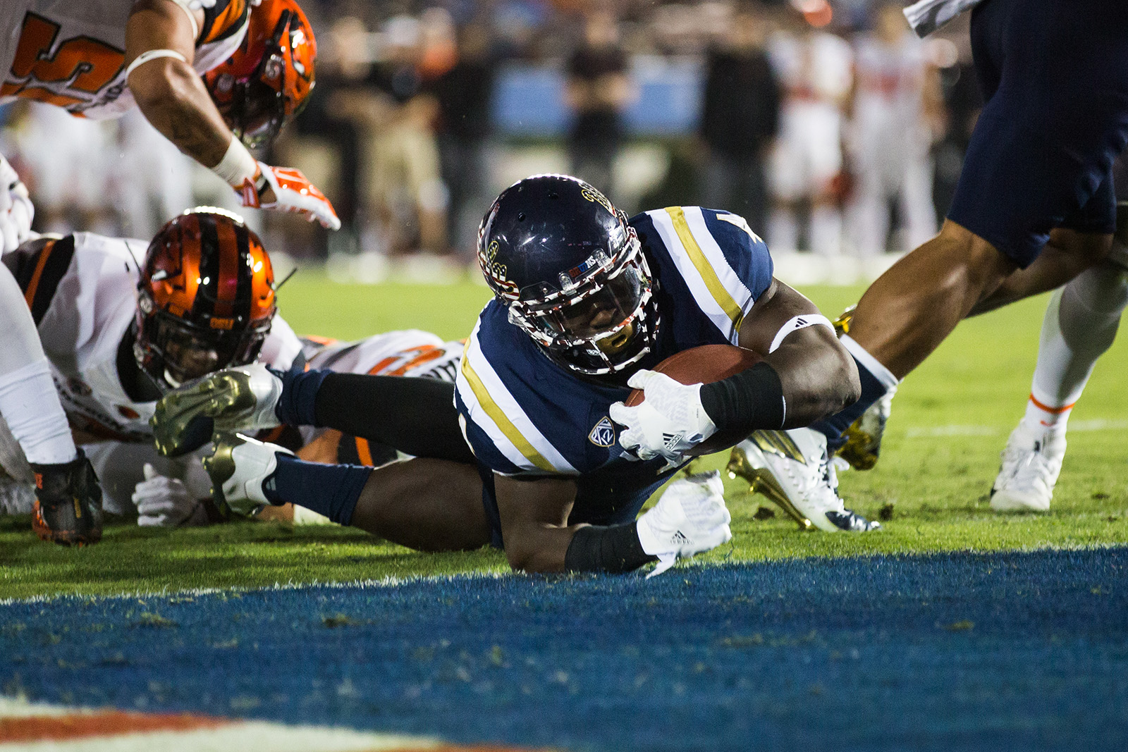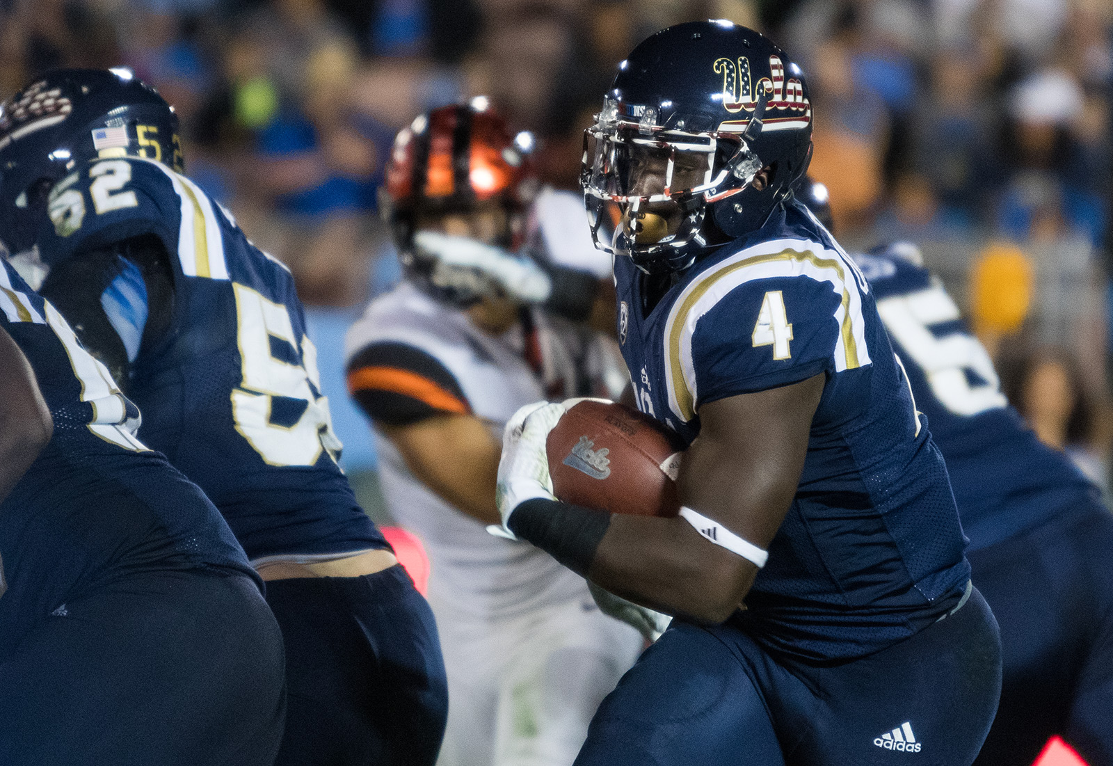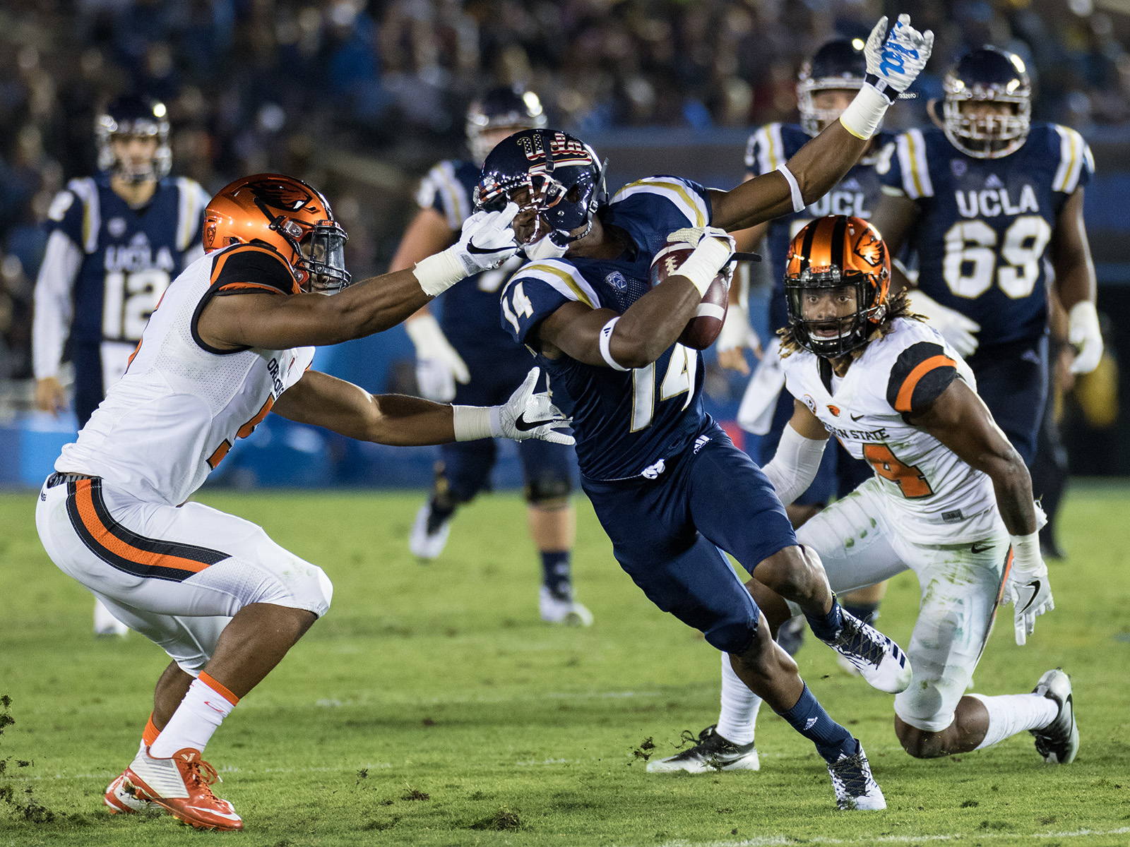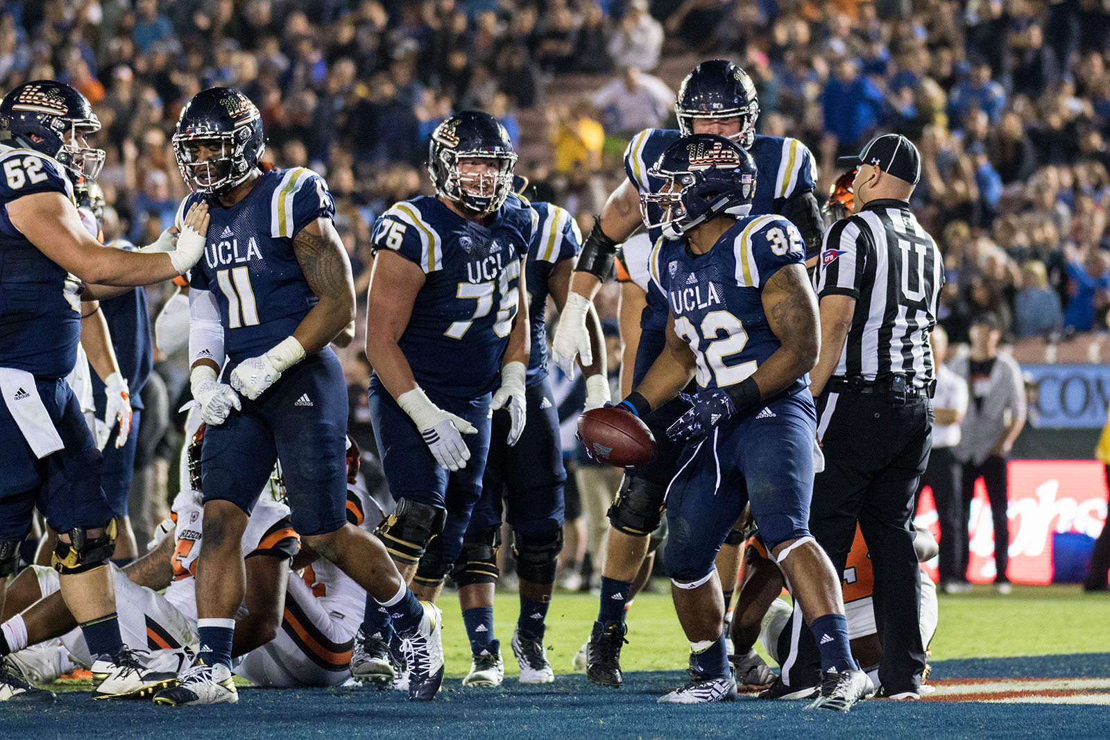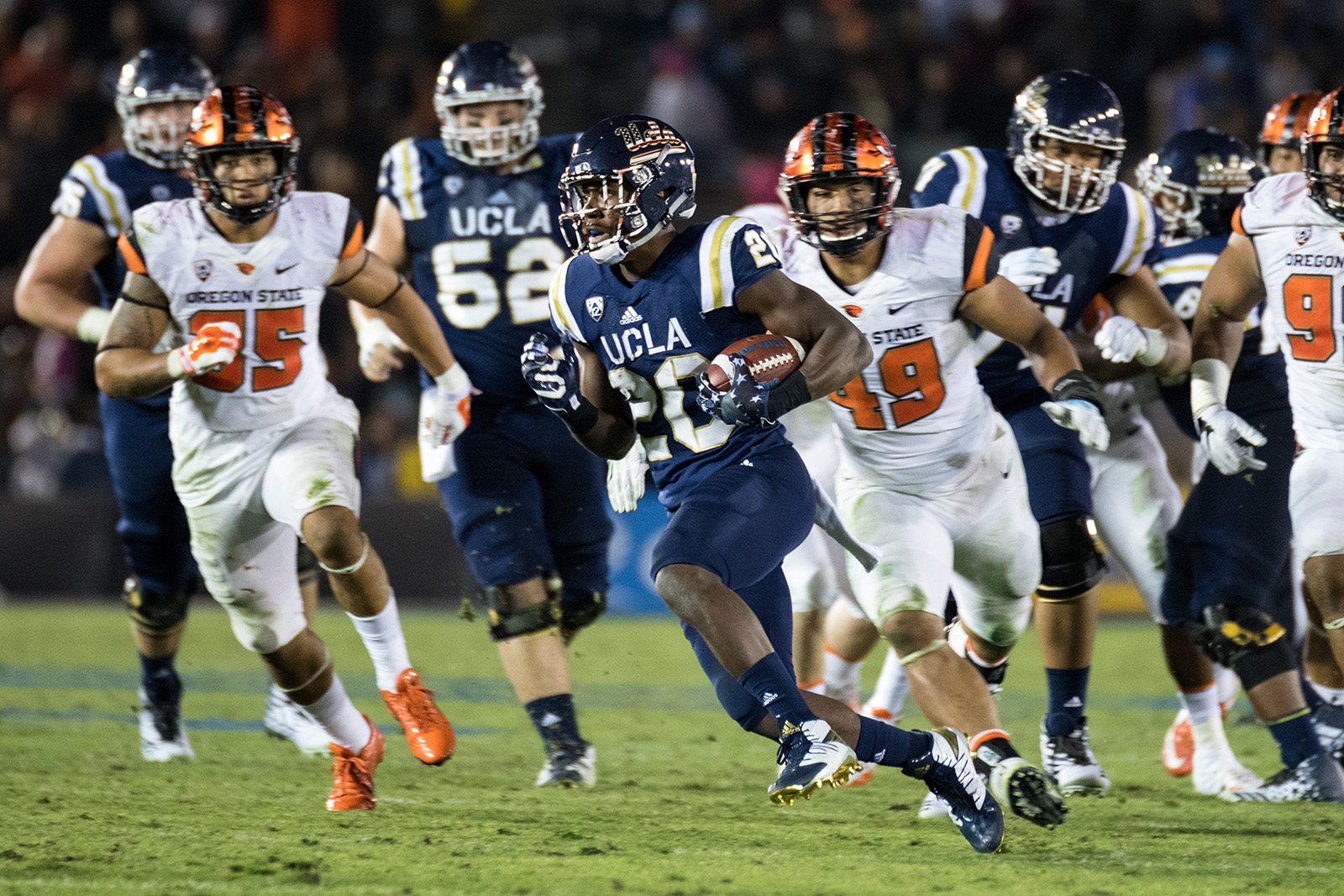 Though Oregon State scored first, taking advantage of an opening-drive fumble by sophomore running back Soso Jamabo to take a 7-0 lead, the Bruins quickly responded with a pair of rushing touchdowns and a special teams score.