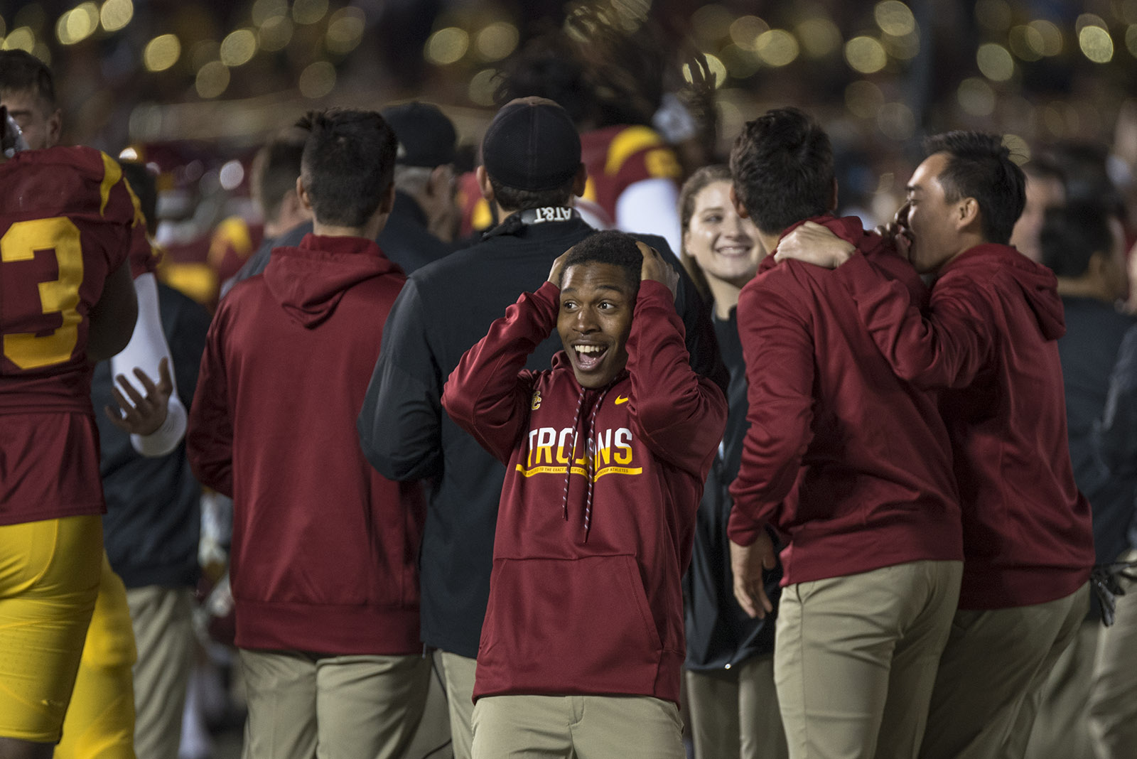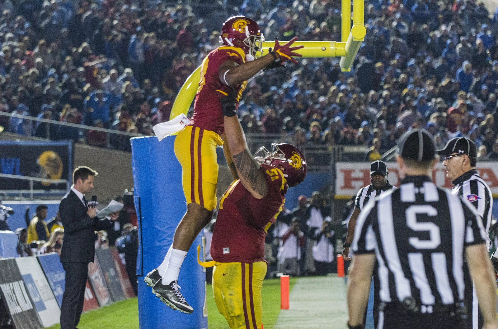 USC senior wide receiver De'Quan Hampton was lifted into the air after he completed a 6-yard touchdown pass to tie the game at 14-14.