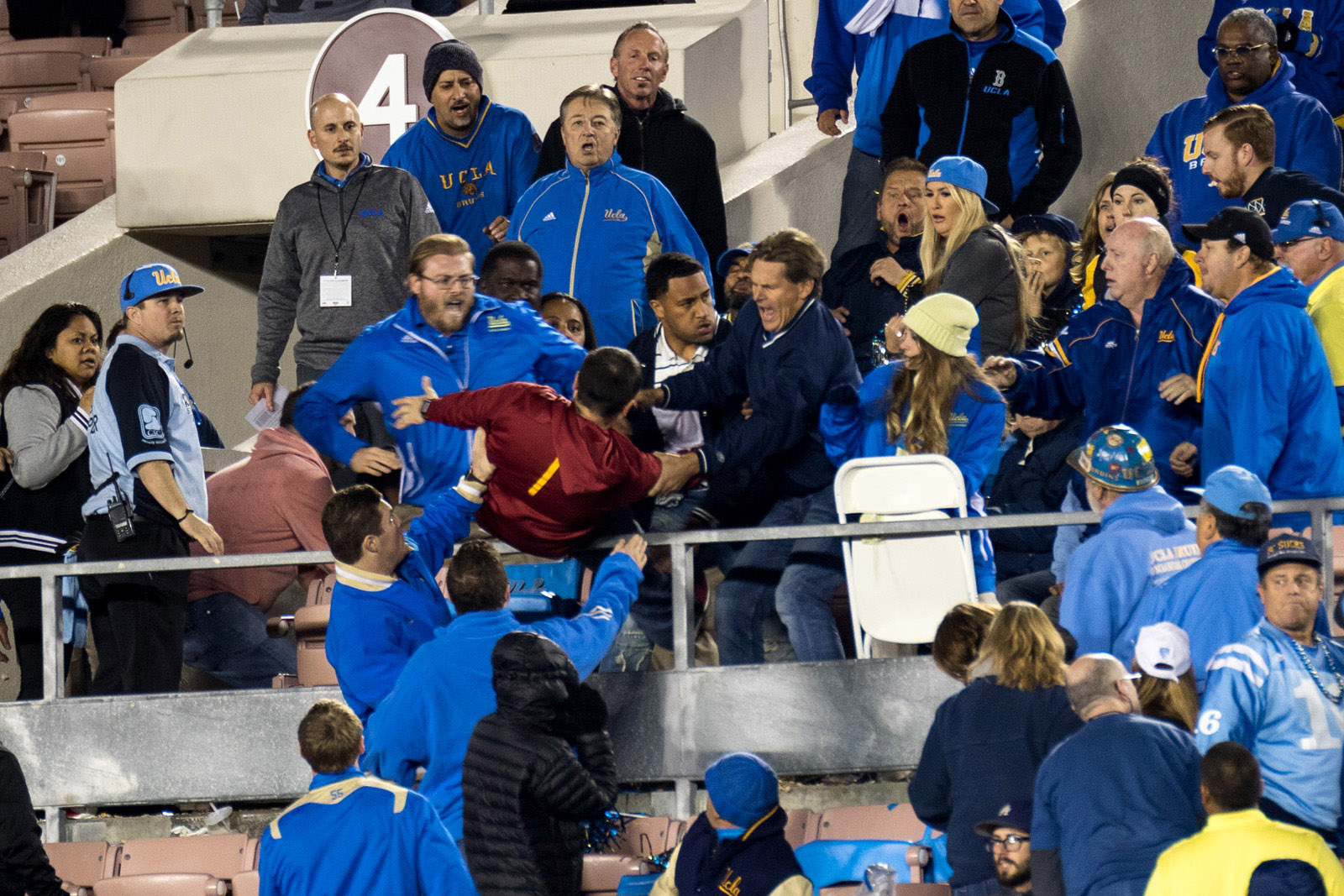 Brawls broke out in the crowd in the second half between UCLA fans and a USC supporter. They exchanged punches and swung chairs until security broke the fight up.