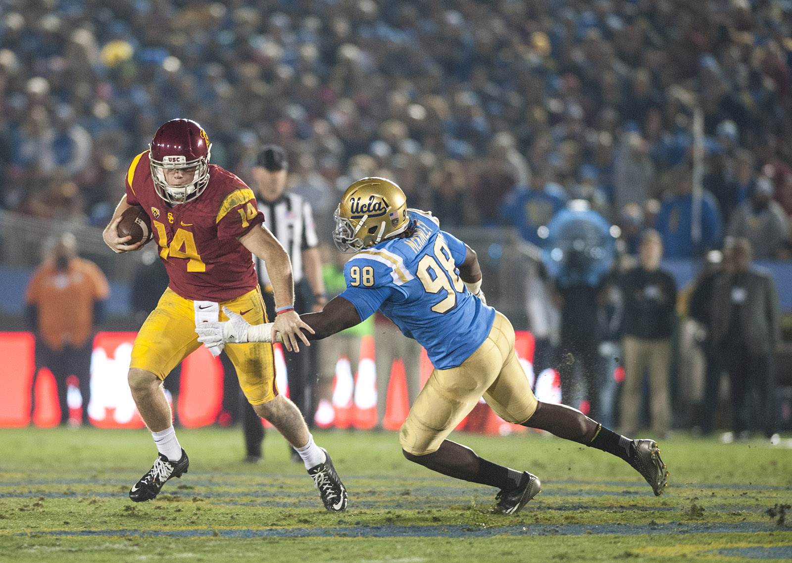 Senior Takk McKinley tries to stop USC quarterback Sam Darnold. McKinley and the Bruin defense could not contain the freshman as he went 25-of-36 for 267 yards.