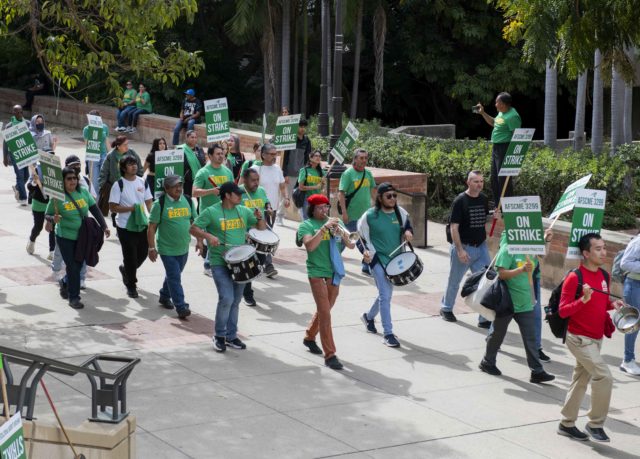Demonstrators from AFSCME Local 3299 made their way back into Bruin Plaza around 8:33 a.m. Luz Lopes, who has worked as a janitor for 20 years, said she she joined the picket line to advocate for better pay.