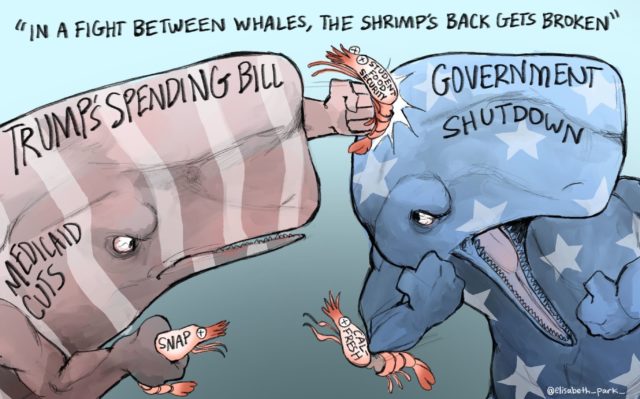 Editorial Cartoon: “In a fight between whales, the shrimp’s back gets broken”