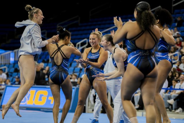 UCLA gymnastics gave fans a glimpse of what it has to offer Saturday afternoon at Pauley Pavilion during its annual Meet the Bruins showcase. Stuck landings, debuted routines and a palpable positive atmosphere – with teammates dancing together and sprinting in for group hugs after every routine – defined the exhibition.