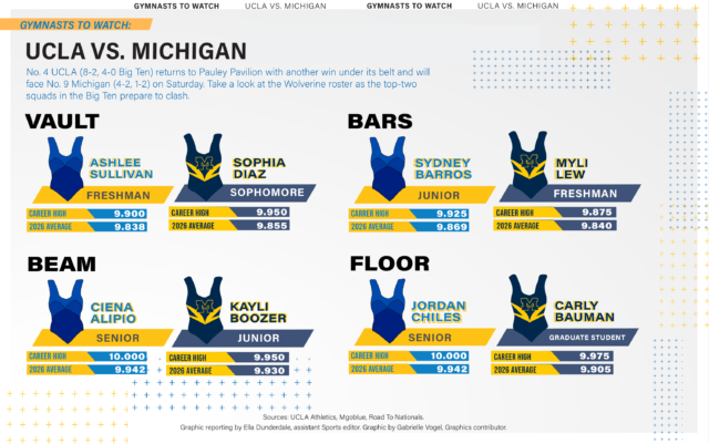 No. 4 UCLA gymnastics will face No. 9 Michigan on Saturday in a top-ranked Big Ten matchup. Daily Bruin contributor Kate Bergfeld analyzes the Wolverine squad ahead of the clash.
