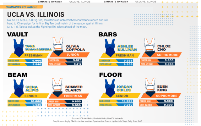 No. 5 UCLA gymnastics (9-2, 5-0 Big Ten) will face Illinois (3-5, 1-4) on Sunday in Champaign. The Bruins enter their fifth consecutive week with a top-five designation, after notching a 197.725 against the Wolverines on Feb. 14 – their second-highest total this season. Daily Bruin contributor Hannah Westerhold breaks down the Fighting Illini’s lineup ahead of the competition.