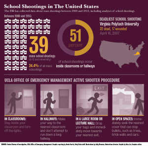 Santa Monica College, 2013. UC Santa Barbara, 2014. Umpqua Community College, 2015. Mass shootings are on the rise at college campuses across the United States. From dorms to classrooms, UCLA is laying out plans to keep students safe in an active shooter situation. More »