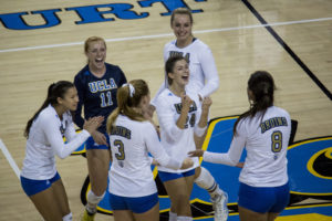 Photo: Sophomore outside hitter Reily Buechler said freshman Zana Muno was pivotal in the Bruins win over the Ducks. Muno had 48 assists in the match. (Aubrey Yeo/Daily Bruin senior staff)